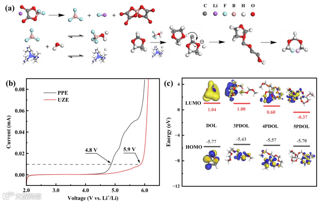 图 2(a)PDOL开环聚合机理 (b)PPE电解质与UZE电解质的LSV曲线 (c)不同分子链长度的PDOL的HOMO/LUMO轨道能级计算