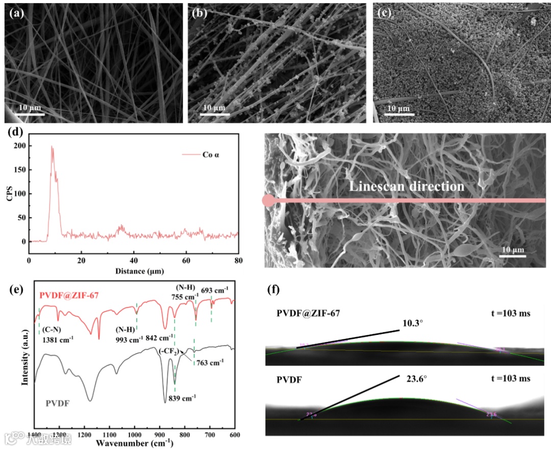 图 5(a) PVDF、(b) PVDF@ZIF-67 和 (c) PVDF@ZIF-67 纤维膜单边沉积表面的 SEM 图像,(d) PVDF@ZIF-67 的 EDS 线扫描区域和线扫描图, (e) PVDF 和 PVDF@ZIF-67 的 FT-IR 光谱,(f) PVDF@ZIF-67 和 PVDF 膜在 t = 103 ms 时的接触角快照。