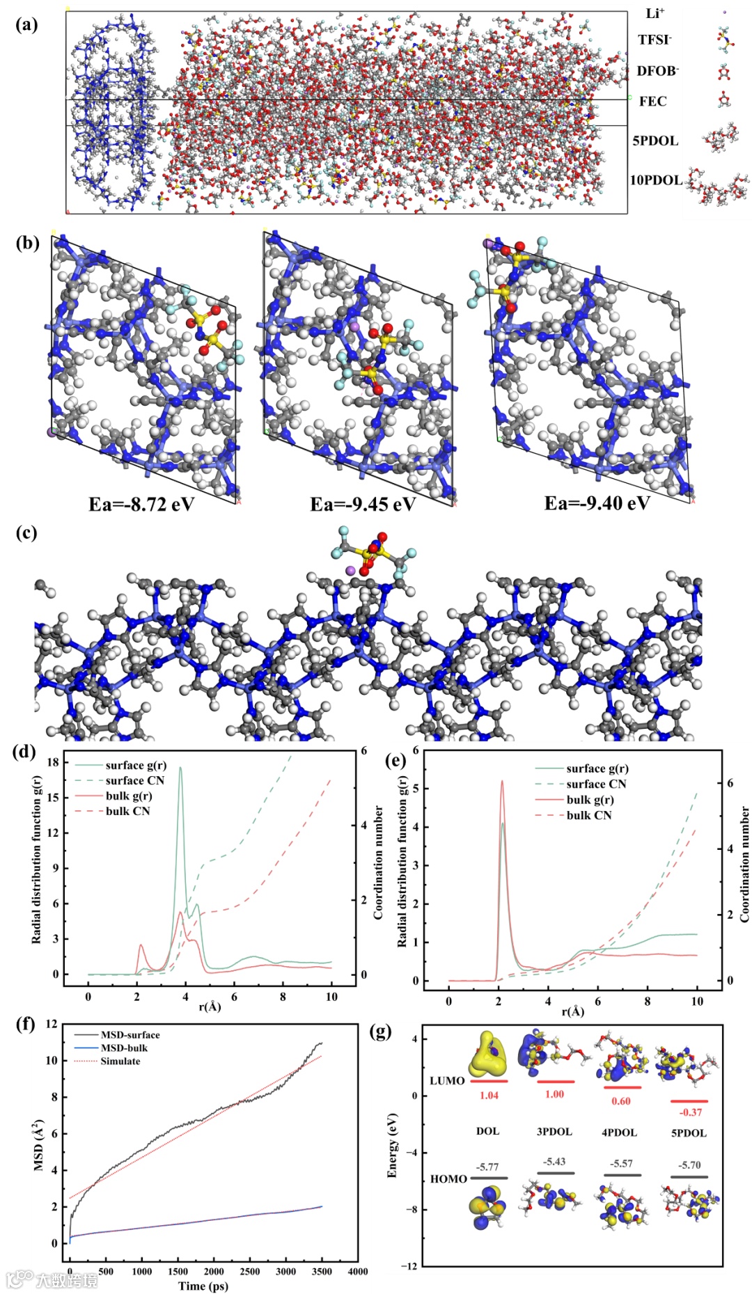 图 4 (a) ZIF-67和PDOL界面的MD模型,(b) LiTFSI吸附的DFT模型,(c) ZIF-67表面吸附能最低的LiTFSI吸附位点,(d) Li-NTFSI-和 (e) Li-OPDOL的径向分布函数和配位数图,(f) Li+ 在体相和表面中的均方根位移,(g) HOMO/LUMO 轨道能级计算图。