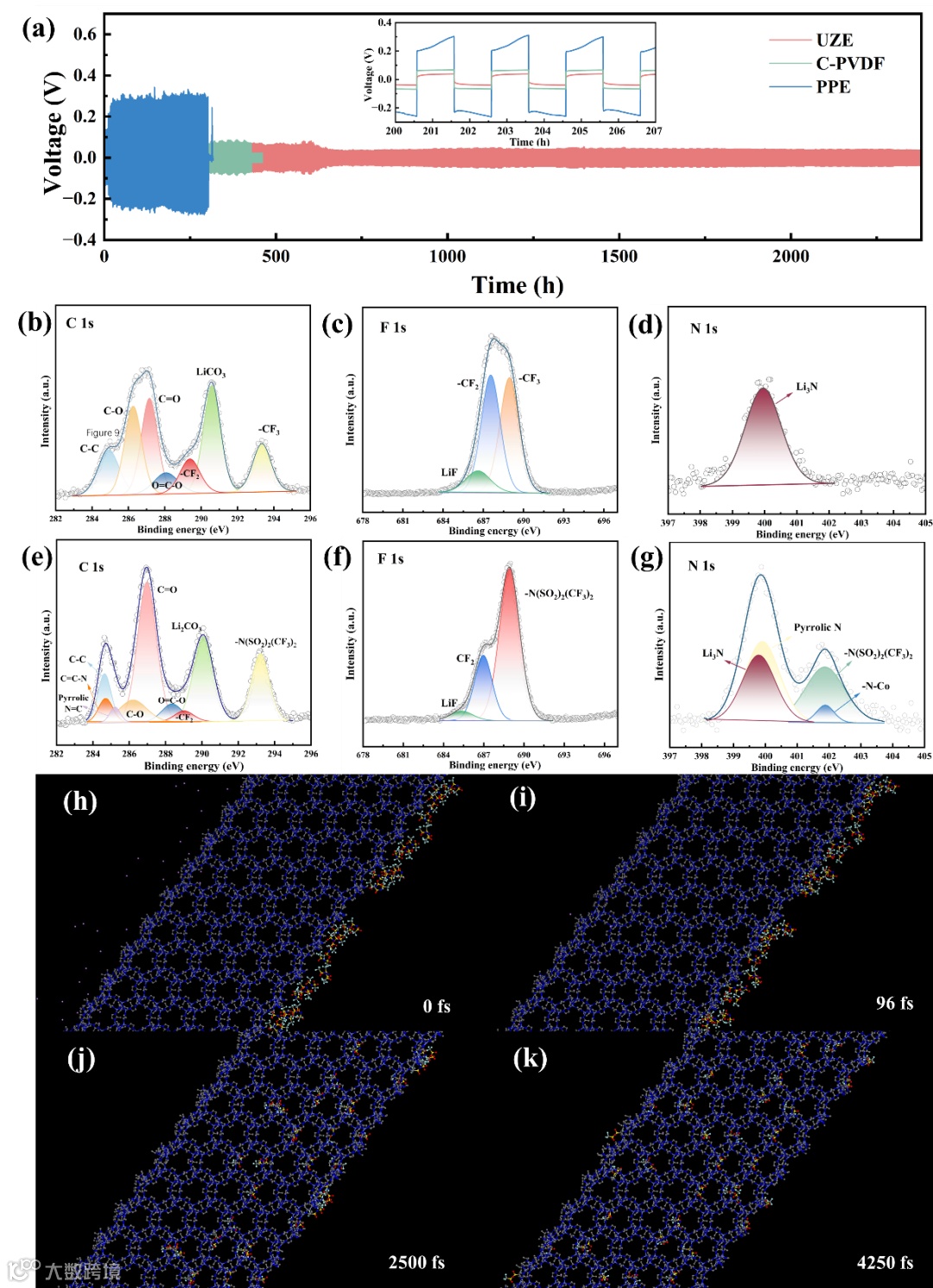 图 6 (a) 具有 PPE 和 UZE 的对称锂电池在 0.1 mA cm−2、容量为 0.1 mAh cm−2 时的电压响应,PPE的(b) C 1 s、(c) F 1 s 和 (d) N 1 s的高分辨率 XPS 谱,PPE的,UZE的(e)C 1 s,(f)F 1 s和(g)N 1 s高分辨率 XPS 谱,选择性沉积层的MD模拟快照(h)0 fs,(i)96 fs,(j)2500 fs , (k) 9600 fs。