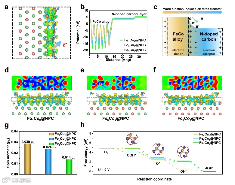 图1:ORR过程的密度泛函理论计算。a)提出了FeCo@NPC中电子结构调控机制。b)催化剂的功函计算。c)FeCo@NPC的电荷转移过程。d-f)催化剂的巴德电荷和差分电荷密度。g)碳层上N原子处的自旋磁矩。h)极限电压下的不同催化剂的ORR过程自由能。