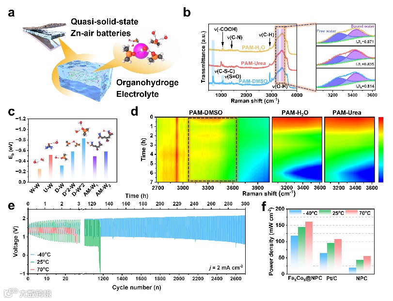 图5:a-d)对准固态锌空电池凝胶的改性以及在极端温度下的表征。d-f)准固态锌空电池极端温度环境下的稳定性和功率密度测试。