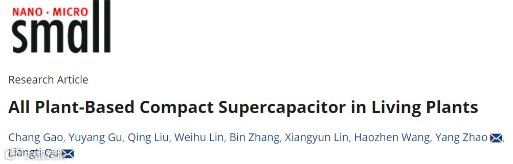 近日,来自北京理工大学的赵扬特别研究员与清华大学的曲良体教授合作,在国际知名期刊Small上发表题为“All Plant-Based Compact Supercapacitor in Living Plants”的研究文章。该研究文章使用芦荟作为研究对象,在活植物中构建电容器,得到了优越的电化学性能,同时研究了其对活植物生长微弱的影响以及在其他多肉类植物的正常使用。