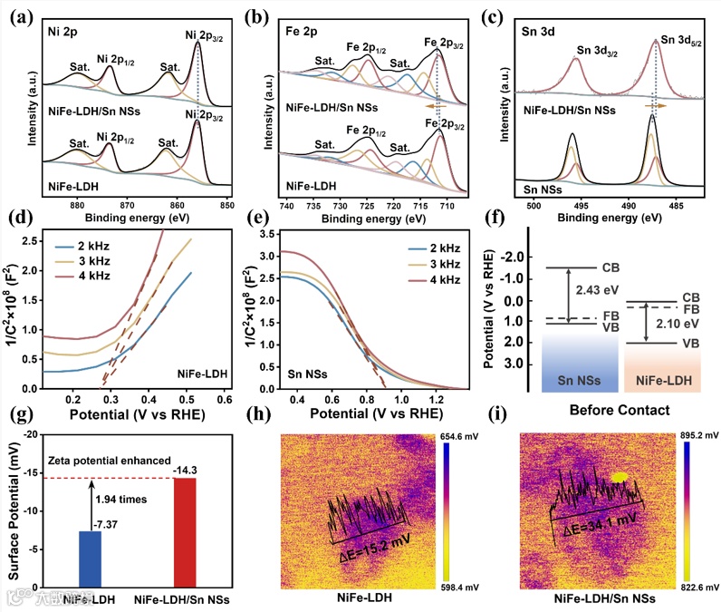 XPS结果显示,NiFe-LDH和Sn NSs之间形成异质结后,Ni 2p峰无明显偏移。然而,与NiFe-LDH相比,NiFe-LDH/Sn NSs的Fe 2p3/2峰表现出0.6 eV的正移。相反,与Sn NSs相比,NiFe-LDH/Sn NSs的Sn 3d光谱表现出0.4 eV的负移。此结果表明,Fe原子与Sn原子在界面处具有强烈的相互作用,由于Sn(1.96)和Fe(1.8)之间的电负性差异,部分Fe电子转移到Sn上。通过紫外可见光谱和莫特肖特基分析获得样品的能带结构。NiFe-LDH的M-S曲线在不同频率下表现出正斜率,属于n型半导体的典型特征。同时,Sn NSs的M-S曲线显示出负斜率,表明其p型半导体特性。当n型NiFe-LDH与p型Sn NSs接触时,由于费米能级不同,会形成p-n结,其周围空穴从p区扩散到n区,而电子从n区扩散到p区。空穴聚集在NiFe-LDH表面,电子集中在Sn NSs面上,形成内部电场。Zeta电位分析结果显示,NiFe-LDH/Sn NSs的Zeta电位为-14.3 mV,比纯NiFe-LDH(-7.37 mV)高1.94倍。KPFM表面电势分析结果显示,NiFe-LDH/Sn NSs的接触电位差为34.1 mV,远高于NiFe-LDH(15.2 mV)。以上结果证明了界面内建电场的形成。(图2)