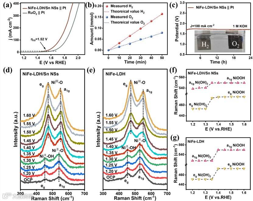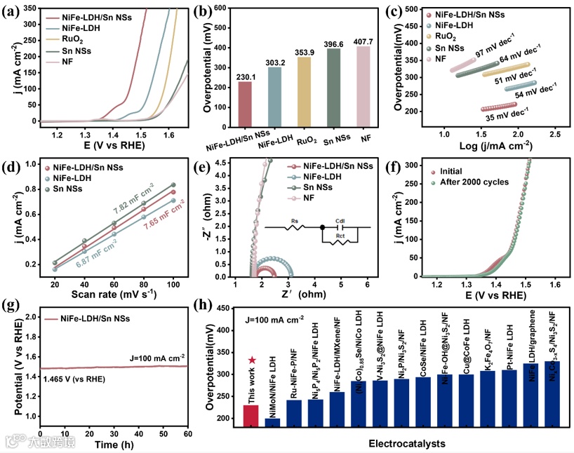 LSV结果显示,2D NiFe-LDH/Sn NSs表现出最优的OER活性,在100 mA cm−2下过电势仅230 mV,优于已报道的同类碱性介质中的OER电催化剂。其Tafel斜率为35 mV dec-1, Cdl为7.65 mF cm−2,明显大于NiFe-LDH (6.87 mF cm−2)。在等效电路下记录奈奎斯特图,催化剂表现出最小的电荷转移电阻,表明电子转移动力学增强。以上结果表明,在界面处的内部电场驱动下,2D NiFe-LDH/Sn NSs异质结构活性位点数量增加,电子转移增强,从而提高了其反应动力学,OER过电势显著降低。