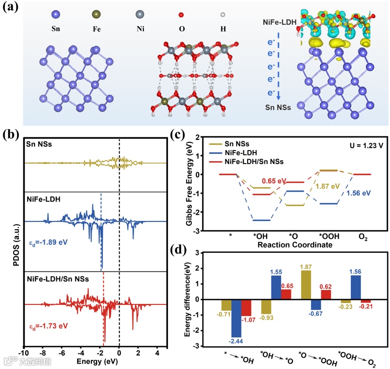 为了进一步探索NiFe-LDH/Sn NSs界面之间的电子结构并揭示其在促进OER催化活性中的作用,进行了DFT计算。DFT结果与电化学测试结果一致,表明构建的2D NiFe-LDH/Sn NSs异质结构催化剂能促进电子的定向传输,优化催化剂的电子结构,降低反应能垒,加速反应动力学(图5)。进一步用碳布及泡沫铁替换泡沫镍基底,构筑的NiFe-LDH/Sn NSs异质界面结构的OER性能均显著高于单独的NiFe-LDH,表明锡烯插入策略具有普适性。