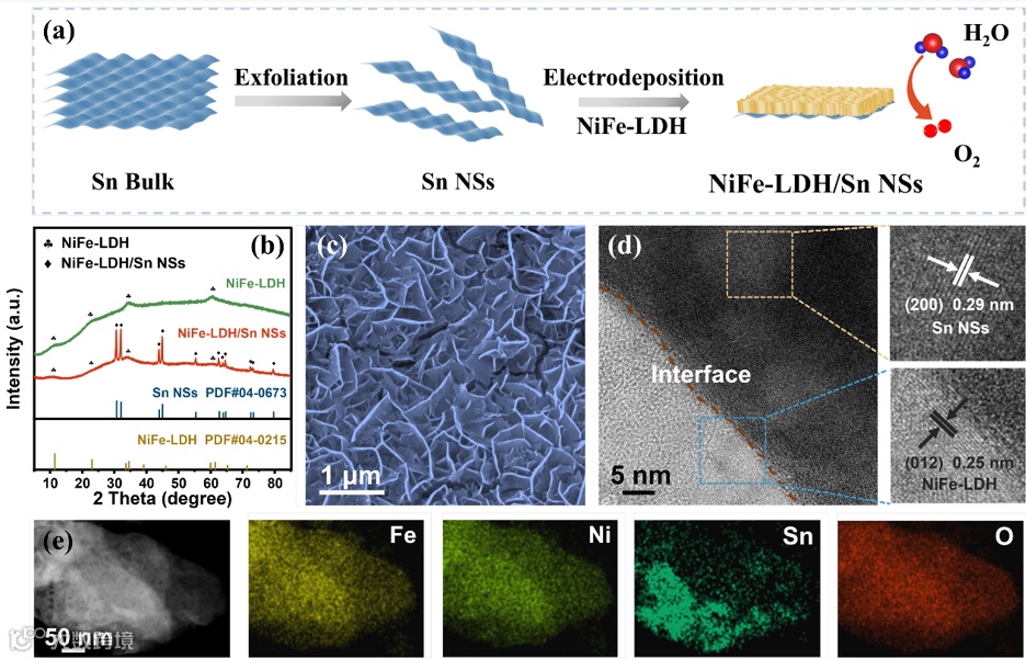 用液相剥离法合成了2D Sn NSs,将其分散在NF上获得Sn NSs/NF,之后通过电沉积得到NiFe-LDH/Sn NSs/NF异质结催化剂。XRD图谱中出现了明显的Sn NSs和NiFe-LDH衍射峰。SEM图像显示了其均匀互连的纳米片阵列结构。HRTEM图像说明催化剂上存在NiFe-LDH/Sn NSs界面结构。EDX图谱显示Fe、Ni、O和Sn各元素均匀分布在NiFe-LDH/Sn NSs上,Sn NSs被NiFe-LDH覆盖。(图1)