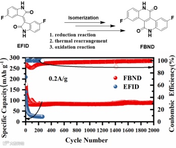 本文采用异靛蓝衍生物EFID通过热重排反应成功构建了异靛蓝衍生物的同分异构体FBND。与EFID相比,FBND不仅具有酰亚胺结构而且还有更大的π共轭体系。因此,有效地解决了有机正极材料在有机电解质中的高溶解性,从而提高了FBND做正极材料的电化学循环稳定性。