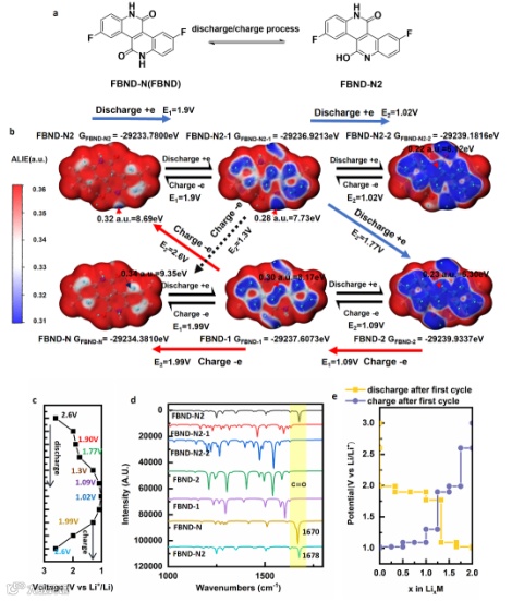 通过非原位红外FTIR测试和密度泛函理论(DFT)计算结合,对FBND正极在放电/充电过程中的多步电化学氧化还原机制进行验证,从而证实了其在化学储能过程中的可行性。总体而言,这项研究提出了一种简单而有效的策略,通过对EFID异构化后得到FBND框架,成功地克服了有机小分子电极在有机电解质中的溶解性问题,从而得到高电化学循环稳定性,为今后开发高稳定性的小分子有机正极材料的设计提供了新的思路。