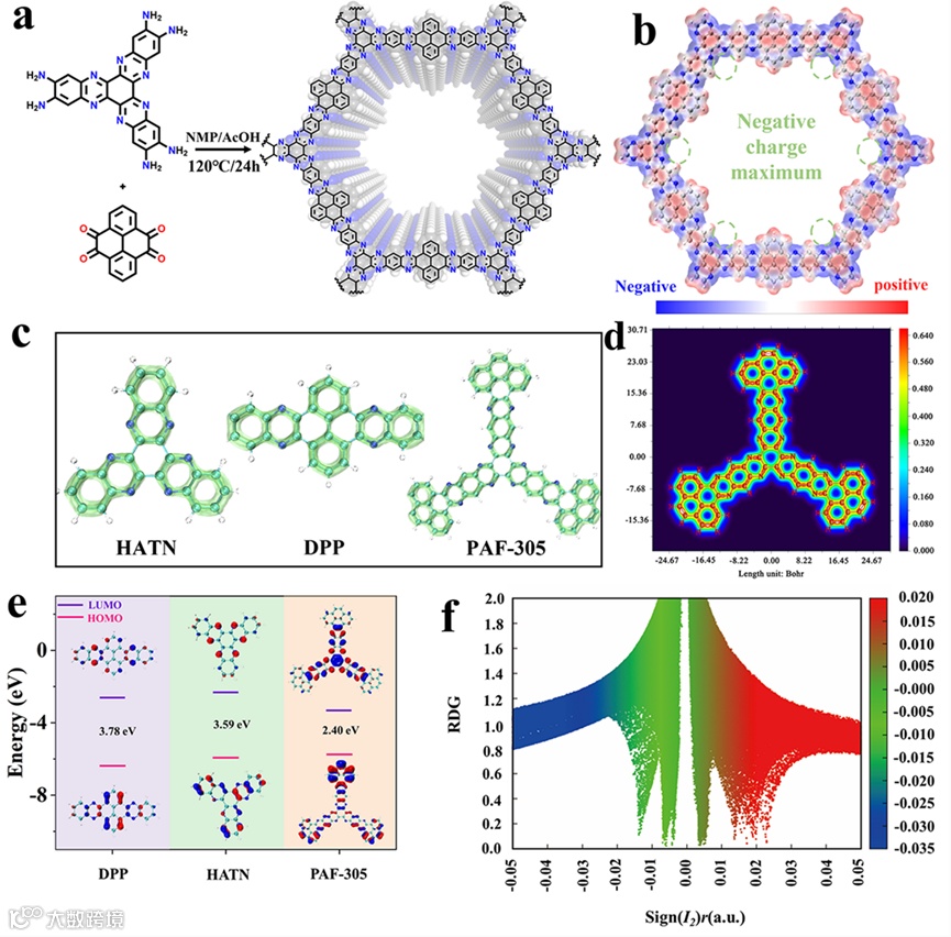 图2. (a) PAF-305的合成和结构。(b) PAF-305单元静电势(ESP)图。(c) HATN、DPP和PAF-305单元的LOL-π图。(d) PAF-305单元的LOL-π着色图。(e) HATN、DPP和PAF-305单元的HOMO、LUMO和间隙能比较。(f). sign(λ2 )ρ vs. RDG的散点图。