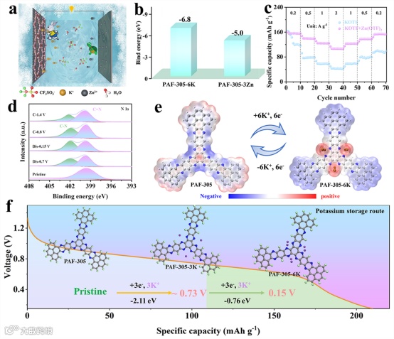 图 4. (a) AZKHB的工作机理图。(b) 通过DFT计算得出的PAF-305单元与不同金属的结合能。(c) PAF-305与KOTF和Zn-K电解液的倍率对比。(d) PAF-305在GCD过程中N 1s的XPS能谱。(e) PAF-305单元和PAF-305-6K的静电电势(ESP)等值面图。(f) 计算的K+储存路线。