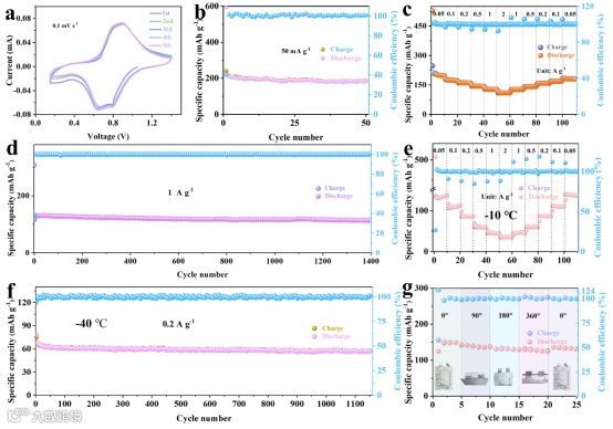 图 5. (a) PAF-305在0.1 mV s-1时的CV曲线。(b) PAF-305在0.05 A g-1时的循环性能。(d) PAF-305在1 A g-1时的循环性能。(e) PAF-305在-10 °C下的倍率性能。(f) PAF-305在-40 °C、0.2 A g-1下的循环性能。(g) 软包装AZKHB在不同弯曲状态下、0.05 A g-1下的循环性能。