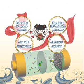 图1. 所设计的空气自充电电池可以实现以K+为离子载体、调节Zn2+溶剂化化学、全气候下空气自充电特性。