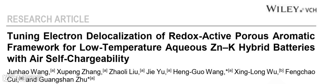 近日,来自东北师范大学的王恒国/朱广山教授,在国际知名期刊Angewandte Chemie International Edition上发表题为“Tuning Electron Delocalization of Redox-Active Porous Aromatic Framework for Low-Temperature Aqueous Zn–K Hybrid Batteries with Air Self-Chargeability”的文章。
