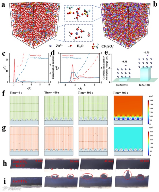 图3. 通过MD模拟得到的 (a) Zn(OTF)2和(b) Zn-K混合离子电解液的三维快照(部分放大的Zn2+溶剂化结构)。不同电解液体系中(c) Zn2+-H2O和(d) Zn2+-OTF-的RDF。(e)Zn和K在Zn(101)晶面上的吸收能比较。(f) Zn(OTF)2和(g)Zn-K电解液在裸锌上的电场分布和相应的Zn2+浓度场分布。通过原位光学显微镜观察(h) Zn-K和 (i) Zn(OTF)2 电解液中Zn箔上的Zn沉积形态。