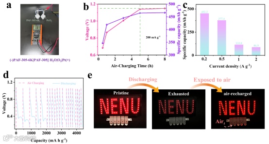 图6.(a)(-)PAF-305-6K|PAF-305||H2O|O2|Pt(+)原电池。(b)不同空气自充电时间下的充电电压和相对应的放电容量。(c)空气自充电过程后不同倍率的放电容量。(d)AZKHBs的重复空气自充电/放电循环图。(e)由五个空气自充电电池供电下的三种不同状态的LED灯泡。