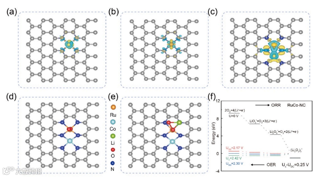 DFT结果表明,RuCo-NC具有大量的电子转移位点,对Li2O2的形成和分解具有更强的正平衡效应。RuCo合金中Ru和Co之间存在明显的电子转移过程,调节了催化剂的电子结构,降低了O2和LiO2的吸附能,从而大大促进反应动力学,有效降低过电位,提高电池的倍率和循环性能。这种策略将为设计高倍率性能和长寿命的Li-O2电池提供新的思路。