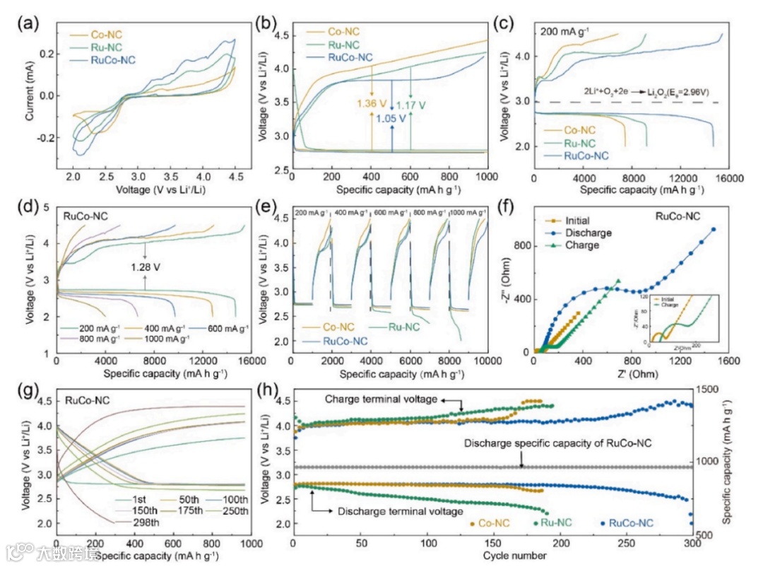 如图所示,以RuCo-NC为正极催化剂的Li-O2电池,电池的过电压降低,倍率性能得到了提高,循环稳定性也得到了大幅提升,说明RuCo的合金化过程,可以提高材料的催化活性,促进Li-O2电池的反应动力学,提高电池性能。