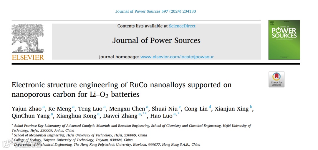 近日,来自合肥工业大学的罗浩和张大伟教授在期刊Journal of Power Sources上发表题为“Electronic structure engineering of RuCo nanoalloys supported on nanoporous carbon for Li-O2batteries”的文章。该文章以纳米多孔碳为载体分散RuCo合金,将其作为Li-O2电池正极催化剂,可以有效地提高电池反应动力学,降低充电过程中的极化。在电流密度为500 mA g-1,限制比容量为1000 mA h g-1下,可以稳定循环298圈。密度泛函理论 (DFT) 计算表明,RuCo合金中Ru与Co之间存在明显的电子转移过程,意味着强烈的电子耦合转移,降低了LiO2中间体的吸附能,从而有效降低了过电位。该工作为未来长寿命和低成本的Li-O2电池的发展提供了新的思路。