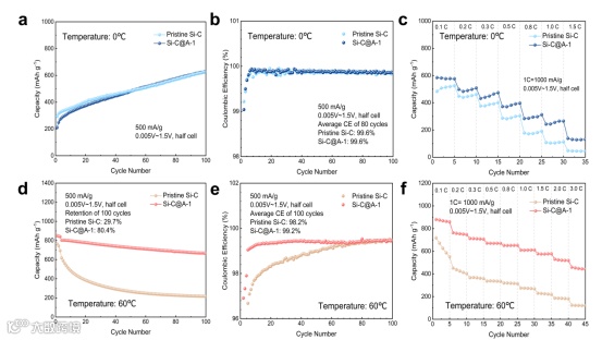 图3. Si-C与Si-C@A在低温(0℃)与高温(60℃)环境下工作的电化学性能分析。