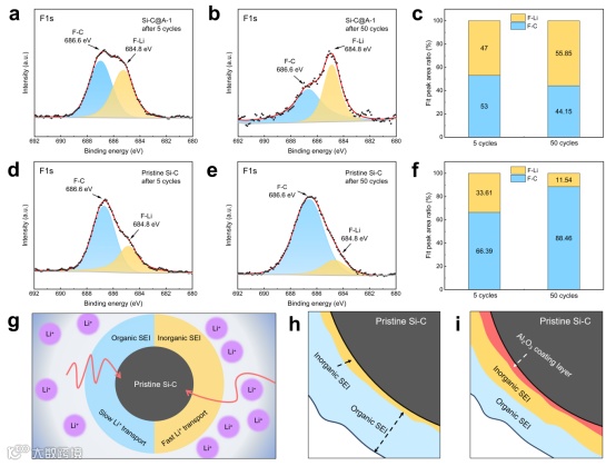 通过表征电池循环过程中的SEI组分可以发现:经过Al2O3涂层包覆的Si-C电极材料在循环过程中所生产的SEI膜含有更高含量的无机组分,而原始Si-C电极的SEI膜有机组分含量更高,这验证了Al2O3涂层在调节SEI膜形成过程中的有效调节作用。此外,硅基负极剧烈的体积膨胀所导致SEI膜的破裂和连续增厚一直是困扰原始Si-C电极的关键问题,而上述刚性Al2O3涂层及其所衍射的富含无机成分SEI膜可以限制硅的体积膨胀进而有效提升电极稳定性。此外,富无机组分的SEI膜还能促进电解质/SEI界面处离子输运动力学。一方面,在初始循环后,Al2O3本身可以作为锂离子运输的高速通路;另一方面,SEI组分可以被调节成富无机态,这将进一步促进锂离子在界面处的传输速率。