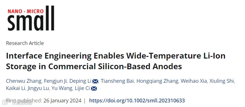 Interface Engineering Enables Wide-Temperature Li-Ion Storage in Commercial Silicon-Based Anodes, Small 2023, DOI: 10.1002/smll.202310633