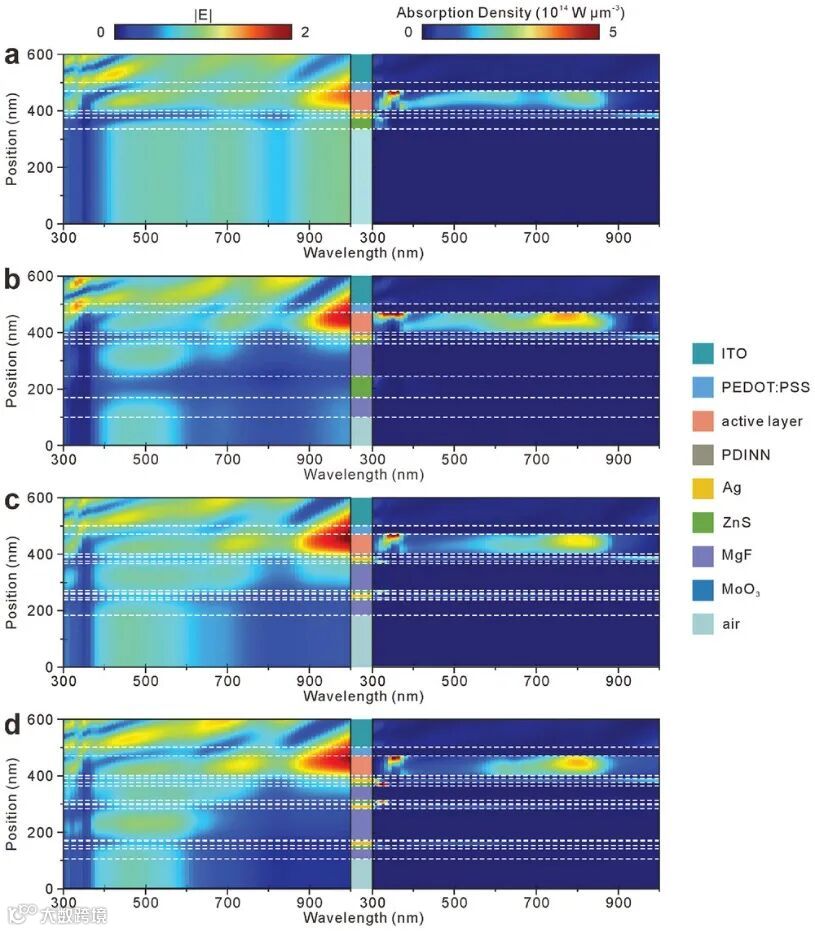 图3. ST-OSCs器件模拟电场分布与吸收密度分布