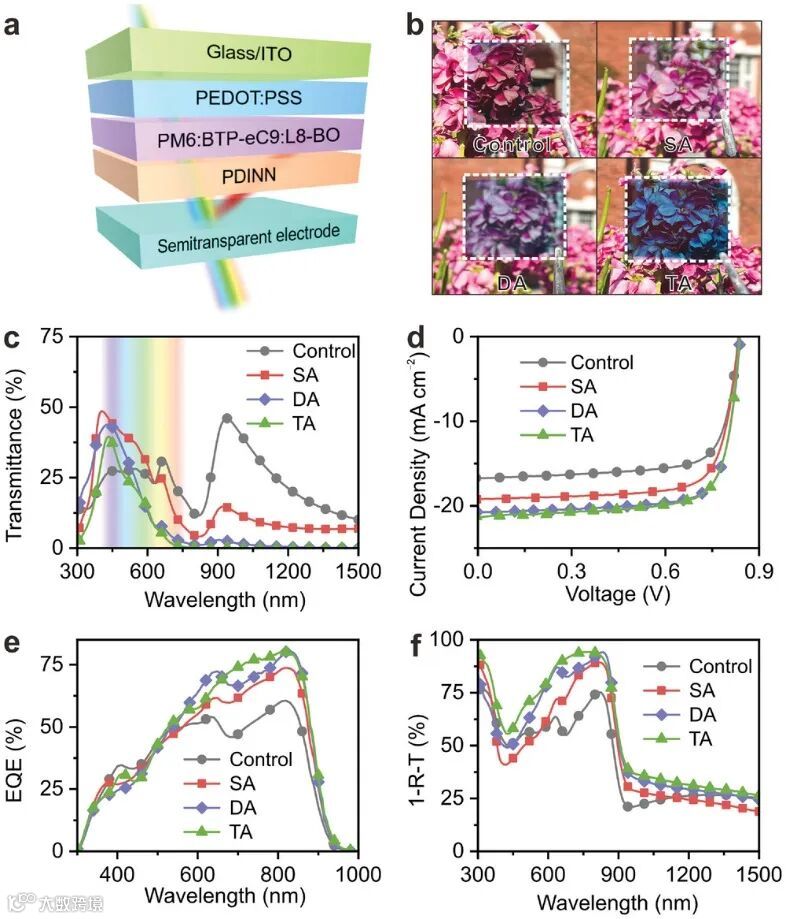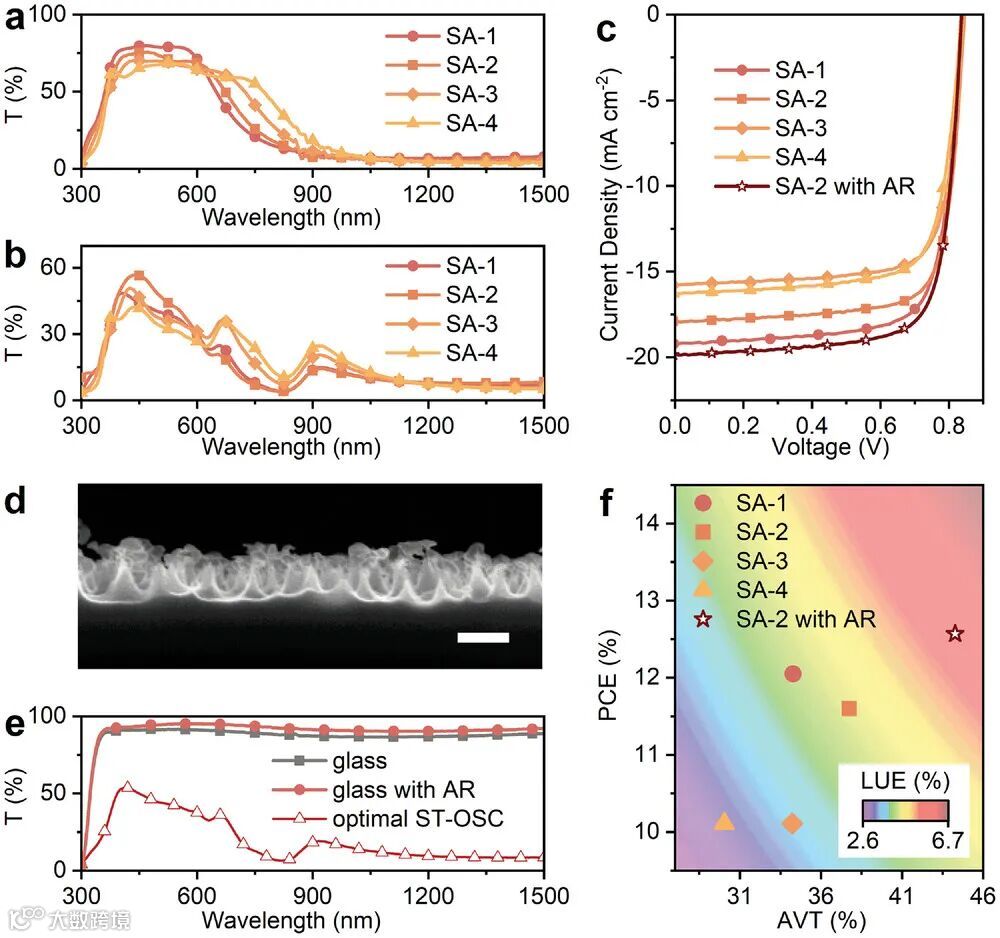 3. 结合蛾眼减反层,ST-OSCs可见光平均透过率和能量转换效率分别达到44.3%和12.6%,最终光利用率超过5.5%。