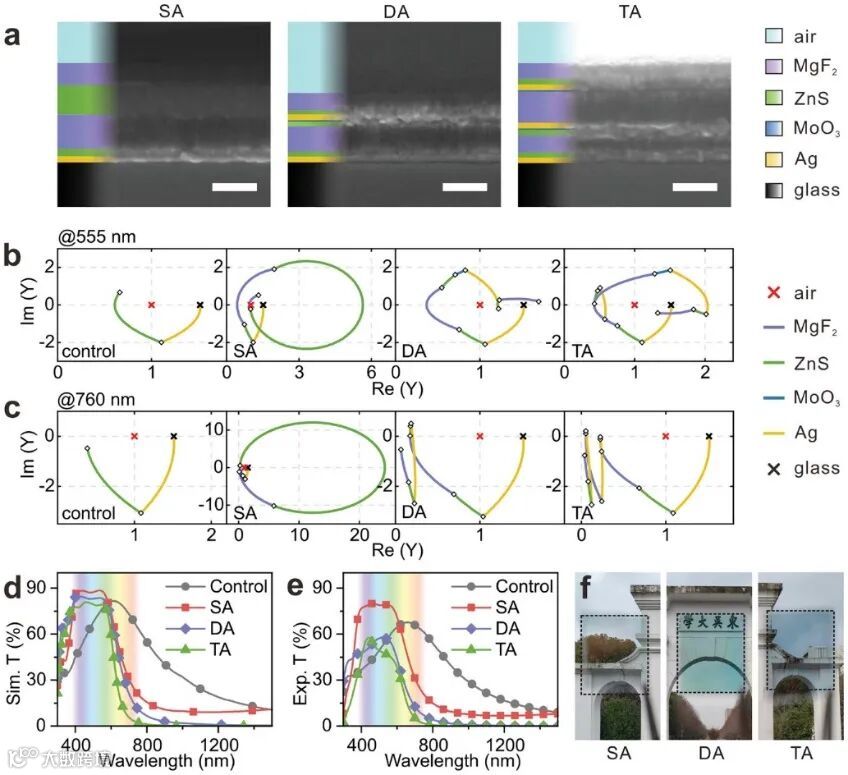 图1. SA, DA, TA电极的模拟和实测光学性能