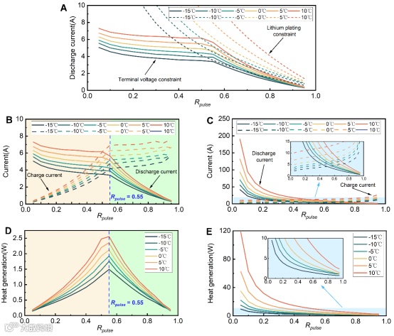 图6 当加热频率为100Hz时,各约束对应的电流幅值和加热功率随放电时间占比的变化。(A)端电压约束和析锂约束对应的放电电流幅值随放电时间占比的变化;(B)(C)端电压约束和析锂约束下充放电电流随放电时间占比的变化;(D)(E)端电压约束和析锂约束下电池产热功率随放电时间占比的变化。