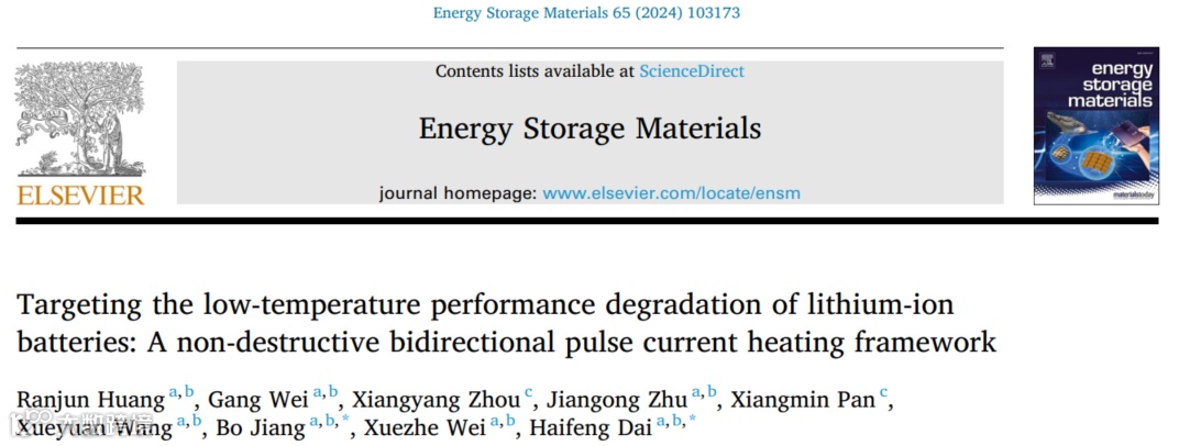 近日,来自同济大学的戴海峰教授在国际知名期刊Energy Storage Materials上发表题为“Targeting the low-temperature performance degradation of lithium-ion batteries: a non-destructive bidirectional pulse current heating framework”的研究论文。博士生黄冉军为本文第一作者。