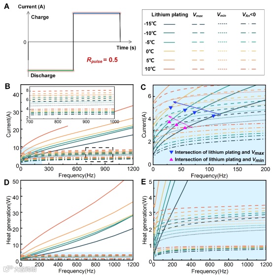 图5 当充放电时间相同时,各约束对应的电流幅值和加热功率随加热频率的变化。(A)充放电时间相同的交流加热方波;(B)(C) 各约束对应的电流幅值随加热频率的变化;(D)(E)各约束对应的加热功率随加热频率的变化。