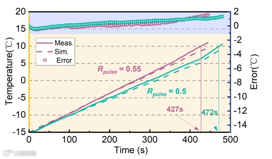 此外,为了验证以上的分析结果,在100Hz下分别用放电时间占比为0.55和0.5设计了两种加热实验,两种实验将电池从-15℃加热到10℃,每隔5℃调整一下电流幅值,结果如图7所示。实验表明,相对于传统的对称方波交流加热方案,优化充放电时间比例能够有效地提高电池的温升速率。并且,还补充了100次循环加热实验,实验结果表明电池容量没有明显变化。这证明了本文加热方案对电池无损。