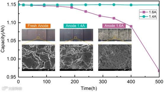 在-10℃下,根据析锂判据计算1Hz交加热频率对应的析锂发生的电流幅值为1.37A。在相同条件下利用电热耦合模型计算的石墨负极电位等于0V对应的电流幅值为0.98A。分别在-10℃下设计交流加热幅值为1.4A和1.6A的1Hz交流加热老化实验,结果如图4所示。结果表明本文提出的析锂判据相对于直接利用参比电极测量石墨负极小于0V作为析锂判据更加准确。