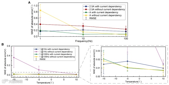 为了保证低温环境下锂离子电池的温升速率,通常低温高频交流加热幅值较大。然而,当前面向交流加热的电热耦合模型少有考虑交流幅值的影响。本文首先利用1Ah软包电池制作了三电极电池。在20%SOC下,分别在-15℃,-10℃,-5℃,0℃,5℃和10℃下,测量了交流幅值为0.25A,0.65A,1A,1.5A,2A和2.5A的交流阻抗,如图1所示。结果表明无论是正极还是负极,在中低频区域内,阻抗明显受电流幅值的影响。因此,基于小电流幅值激励的EIS测试来对电热耦合模型参数进行标定存在一定的误差。本文设计的面向交流加热的电热耦合模型如图2所示,模型参数利用图1中的结果进行标定。图3展示了考虑幅值的电热耦合模型和不考虑幅值影响下温度和端电压的对比结果。结果表明,考虑幅值的电热耦合模型在中低频区间计算的电池的温升和端电压更准确,并且幅值对电压的计算要比温度的计算影响更大。