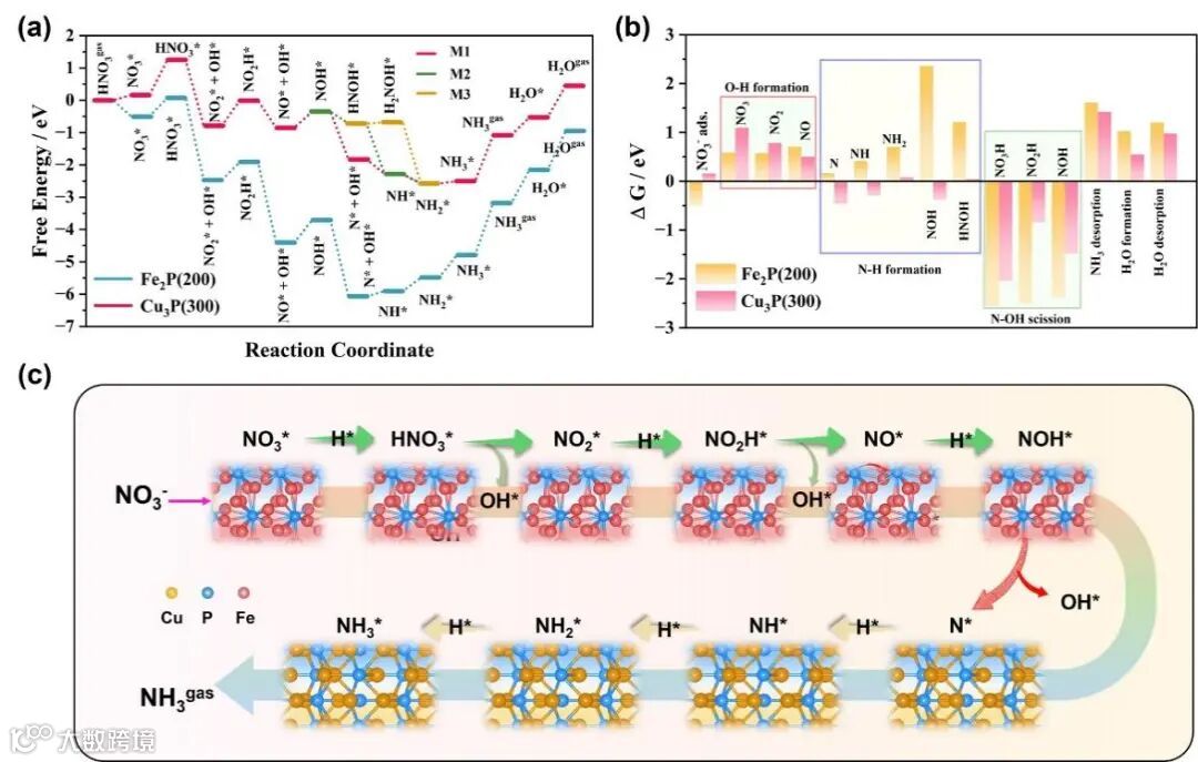 利用原位红外和在线DEMS以及DFT计算对制备的CuFe-P/IF电极进行了研究,揭示了反应过程中的关键N中间体以及催化剂高催化活性和稳定性的机理。eNO3RR过程中的初始激活步骤发生在Fe2P位点,参与捕获NO2−/NO3−反应底物, 生成O-H键和N-OH键的断裂。随后生成的中间体迁移Cu3P表面,Cu3P在随后的步骤中变得更占主导地位,主要涉及N-H键的形成,OH*物种的释放,以及最终产物氨和水的解吸来重新释放活性位点。