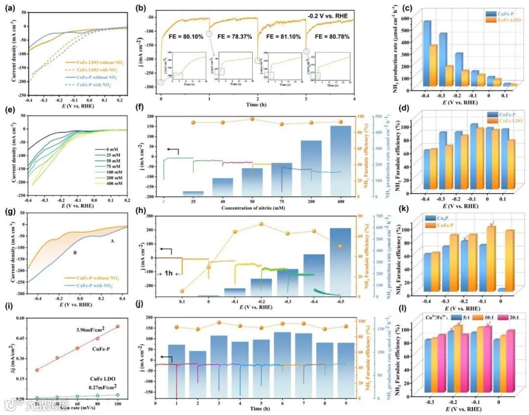 图4 铜铁双金属磷化物异质结构催化剂的电催化亚硝酸根和硝酸根合成氨的性能表征
