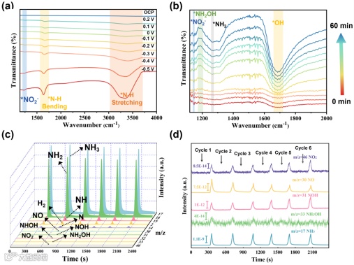 图5 CuFe-P/IF电催化NO2RR过程中原位DRIFT和在线DEMS光谱。