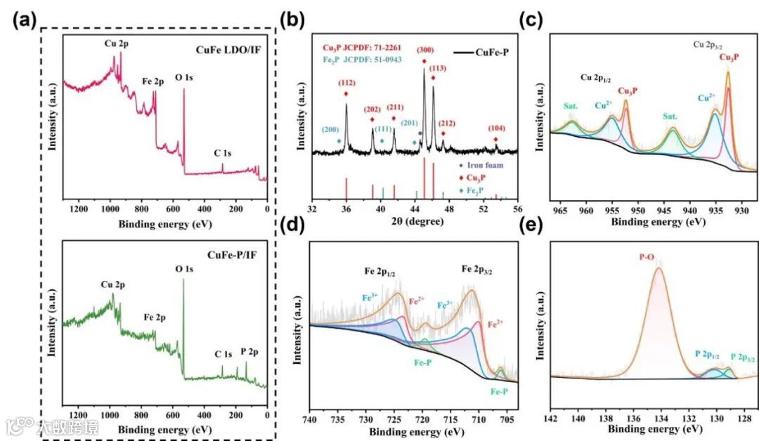 首先利用Fendon体系在泡沫铁上合成出铜铁层状双氧化物(CuFeLDO/IF)前体,然后在氩气气氛下对其进行磷化处理,就得到CuFe-P/IF电极。材料结构及形貌表明在铁泡沫上生长了三维菊花结构的超薄双金属磷化物异质结构纳米片。