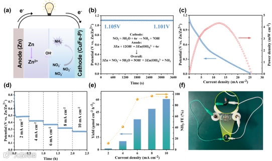 图7组装CuFe-P/IF电极的Zn-NO2-电池的测试及实际应用。