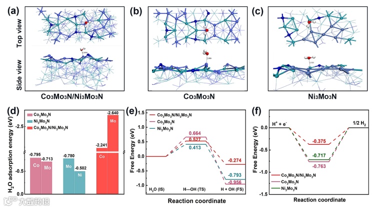 鉴于此,昆明理工大学姚耀春教授团队在国际知名期刊《Chemical Engineering Journal》上发表题为“Porous rod-like structured ternary nitride heterocatalyst Co3Mo3N/Ni3Mo3N for efficient and stable hydrogen evolution reaction”的研究论文。该论文通过采用慢速蚀刻和原位共沉淀策略在泡沫镍上合成了CoMoO4·xH2O/NiMoO4·xH2O异质结构前驱体,随后对前驱体进行800℃高温氮化处理,成功制备了三元氮化物异质结构催化剂Co3Mo3N/Ni3Mo3N。所得的1D/3D分层结构电极具有丰富的异质界面,提供了丰富的活性位点,增强了质量传递和电荷转移。密度泛函理论(DFT)的计算表明,Co3Mo3N/Ni3Mo3N具有较低的水解离能势垒和优化的氢吸附能。因此,它表现出优异的HER 性能,在10 mA cm-2电流密度下,碱性和中性介质中的过电位分别低至36 mV和58 mV。在50 mA cm-2的大电流密度下分别保持45小时和35小时的出色稳定性。该研究对推进三元异质结构催化剂领域提供了有价值的文献参考和创新的见解。同时,对其他过渡金属基异质结构催化剂的设计提供了参考意义。