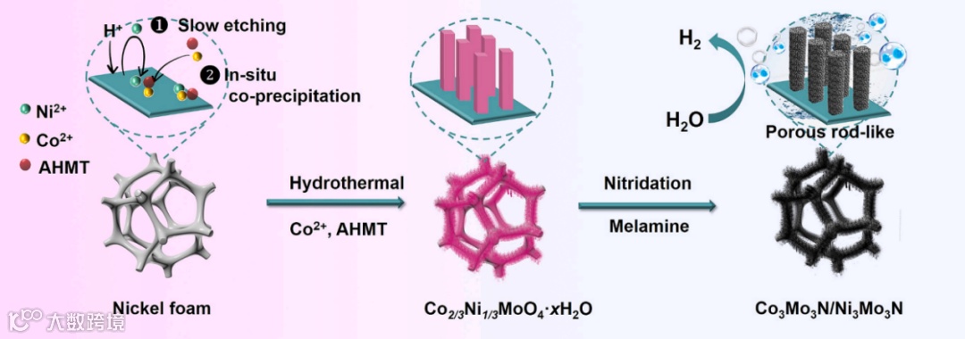 图1. 泡沫镍上Co3Mo3N/Ni3Mo3N异质结构催化剂的制备示意图。