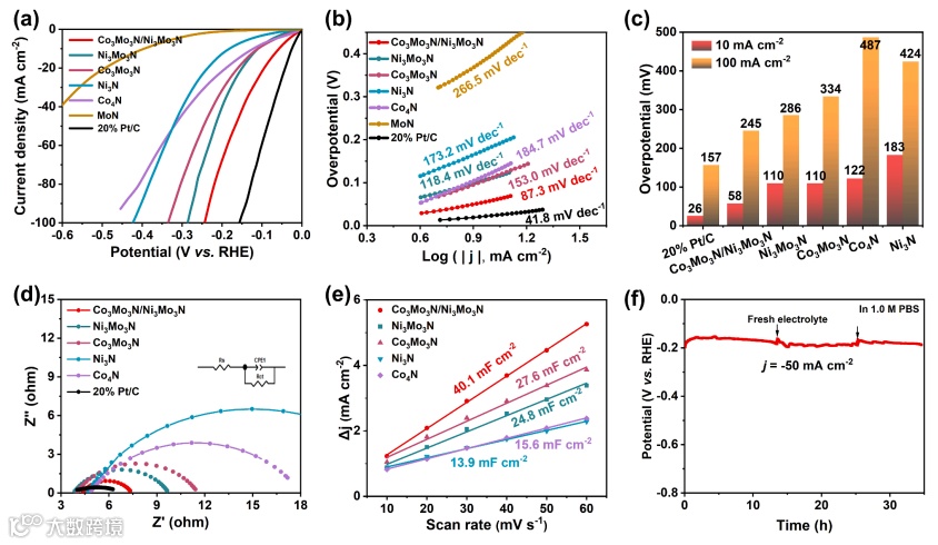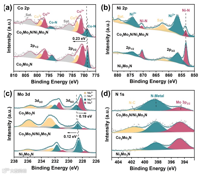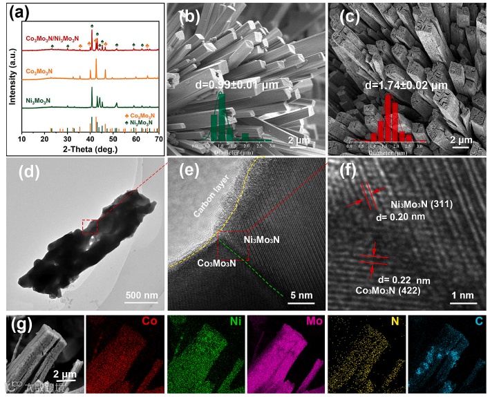 钼基氮化物因其资源丰富、导电性高、耐腐蚀性好、具有类Pt催化性能等特点,作为HER电催化剂引起了人们的极大兴趣。然而,由于水解离动力学缓慢,其碱性HER活性有限。通过引入Co、Ni等与Mo原子协同作用以降低水解离能垒是一种有效的策略。然而,单相三元氮化物面临着无法满足每种反应中间体的最佳吸附自由能要求的挑战,再加上暴露的催化活性位点数量有限,导致催化性能受到限制。异质结构电催化剂因其有效增强电催化活性而受到广泛关注。一些氮化物基异质结构催化剂表现出增强的HER活性,但目前报道的大多涉及金属/二元氮化物异质结构和二元/二元氮化物异质结构。纯金属相的引入虽然可以增强HER活性,但它们的表面容易转化为氧化物或氢氧化物,从而降低HER活性。二元氮化物中的M−H键可能太强或太弱,可能会阻碍优化的HER催化。因此,开发三元氮化物基HER异质结构催化剂具有明显的优势和应用前景。目前,尚未有关于三元/三元氮化物异质结构催化剂用于HER的报道,其合成仍然具有挑战性。