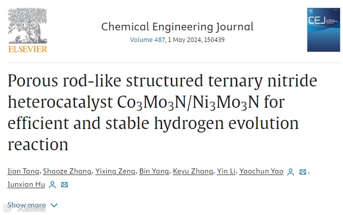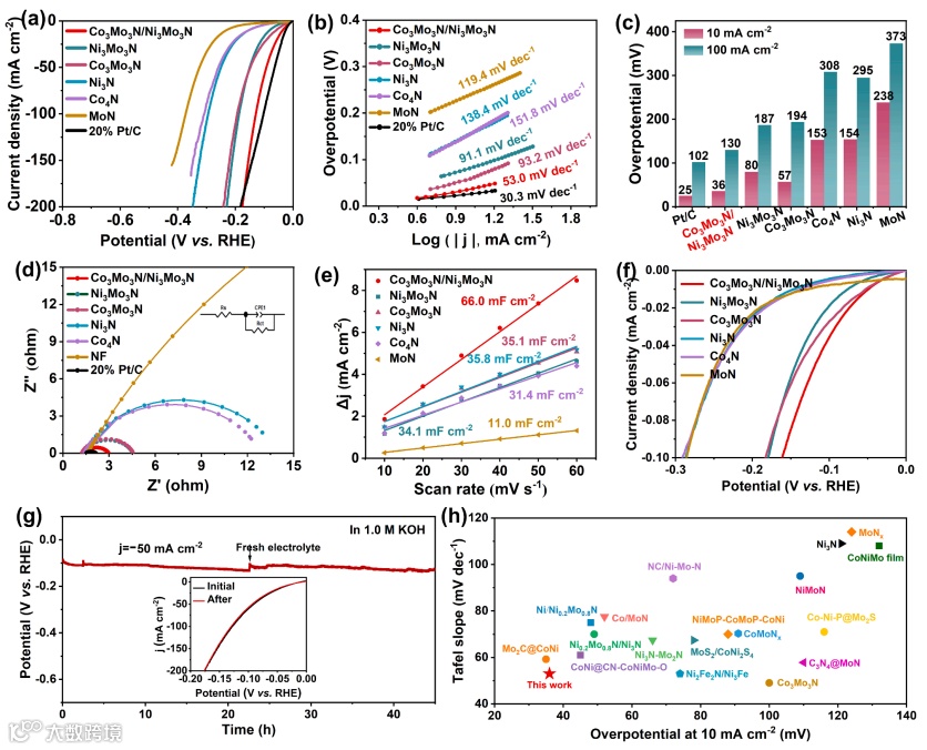 Porous rod-like structured ternary nitride heterocatalyst Co3Mo3N/Ni3Mo3N for efficient and stable hydrogen evolution reaction.