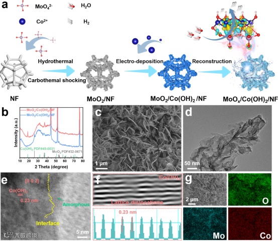电催化海水裂解是近年来研究的热点。寻求高活性海水基电催化剂的设计,对于降低基础科学与行业期望之间的差距尤为重要。近年来,作为优异的电催化产氢催化剂的候选者,钼基催化剂由于其高的导电性和活性受到了广泛的研究。然而,在碱性条件下,特别是大电流密度下,钼基催化剂的活性极易受到钼溶解的影响。因此,开发一种新型的合成方法去解决钼溶解的问题对于高效钼基电催化剂合成十分重要。在此,我们利用Mo的溶解现象,制备了一种具有高活性和耐腐蚀性的非晶/结晶的MoOx/Co(OH)2电催化剂(MoOx/Co(OH)2/NF)。