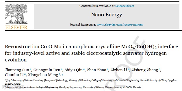 近日,来自中国海洋大学的孟祥超教授,在国际知名期刊Nano Energy上发表题为“Reconstruction Co-O-Mo in amorphous-crystalline MoOx/Co(OH)2 interface for industry-level active and stable electrocatalytic seawater hydrogen evolution”的文章。该文章利用催化剂的子重构过程,实现了高活性和耐腐蚀性的非晶/结晶的MoOx/Co(OH)2/NF电催化剂的制备。该研究可为制备高活性、耐腐蚀的电催化剂提供新的思路,并进一步发展工业制氢。
