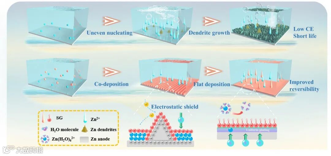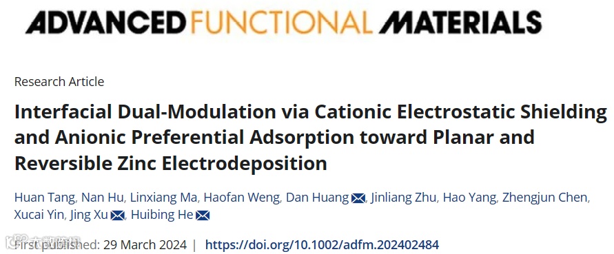 近日,来自广西大学的何会兵副教授在国际知名期刊Advanced Functional Materials上发表题为“Interfacial Dual-Modulation via Cationic Electrostatic Shielding and Anionic Preferential Adsorption toward Planar and Reversible Zinc Electrodeposition”的观点文章。该观点文章提出了一种界面双重调控策略,通过葡萄糖酸钠(SG)添加剂提高锌阳极的可逆性。