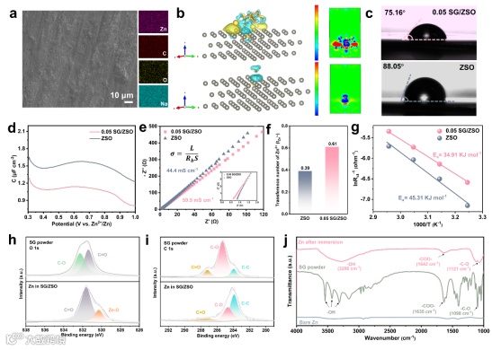 图 1 a) Zn 金属箔在 SG/ZSO 中浸泡 1 天后的 SEM(俯视)图像和相应的 Zn、C、O 和 Na 元素的 EDS 图谱。b) H2O 和 SG 与 Zn (002) 平面差分电荷密度的三维等值面图以及相应的二维等值面切片图。g) ZSO 和 SG/ZSO 的Arrhenius曲线。h, i) 浸泡在含有 SG 的电解液中的 Zn 板的 XPS 图谱。