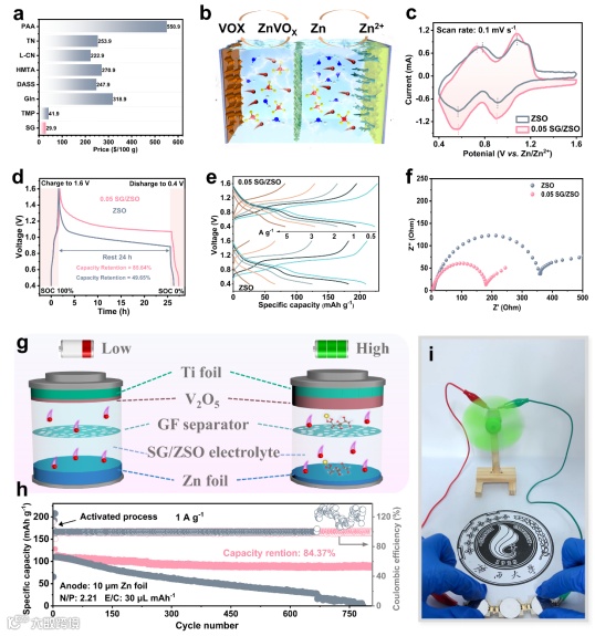 在实际应用中,含SG电解液的Zn//VOX电池可稳定运行800次,在1 Ag-1的条件下容量保持率高达84.37%,这与ZSO电解液体系中快速的容量衰减和波动的CE形成鲜明对比。此外,成功用为三节设计电解液的电池作为电源驱动小风扇,表明含有SG添加剂的ZIBs具有潜在的商业应用价值。