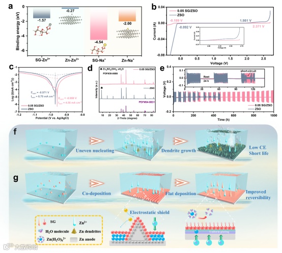 图 4 a) SG、Zn2+ 和 Na+ 离子在锌阳极界面的结合能。b) 通过 LSV 测试确定的纯 ZSO 电解质和 SG/ZSO 电解质的电化学稳定性窗口。c) ZSO 电解质和 SG/ZSO 电解质的塔菲尔曲线。d) 在 ZSO 和 SG/ZSO 电解液中浸泡七天的锌箔的 XRD 图。e) Zn//Zn 电池在交替循环和静置过程中的电化学性能。f, g) 在不含/含 SG 添加剂的 ZSO 电解液中镀锌的示意图。